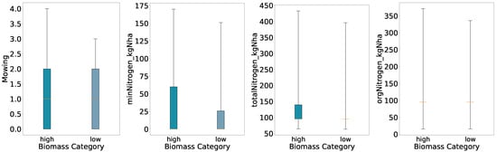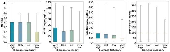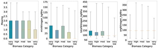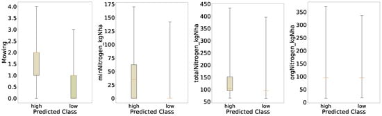 Overall, the preliminary analysis reveals that mowing frequency and nitrogen inputs generally increase with higher biomass classes under coarse segmentation (binary and three-class schemes). As class granularity increases, the spreads broaden almost monotonically up to four classes, indicating consistent positive relationships between inputs and yield. In the five-class scheme, however, the interquartile ranges for mineral and total nitrogen inputs in the High class narrow relative to the Medium class, suggesting that at finer resolution the relationship between nitrogen application and biomass yield becomes more complex and non-linear.