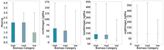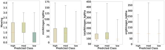 Using three quantiles, both High and Medium retain broader inter-quartile ranges for all variables, while the Low class remains compact for all features. Here we further see decreased ranges and interquartile ranges for low yields, supporting the previous findings for the binary biomass categories; increased amounts of mowing and nitrogen fertilization accompany increased biomass.