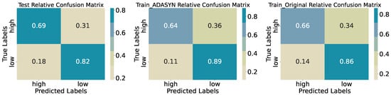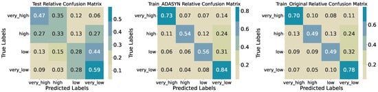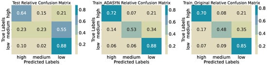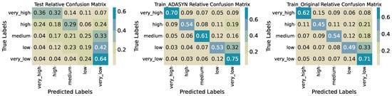 Confusion matrices for training, synthetic training, and test sets (five quantiles).