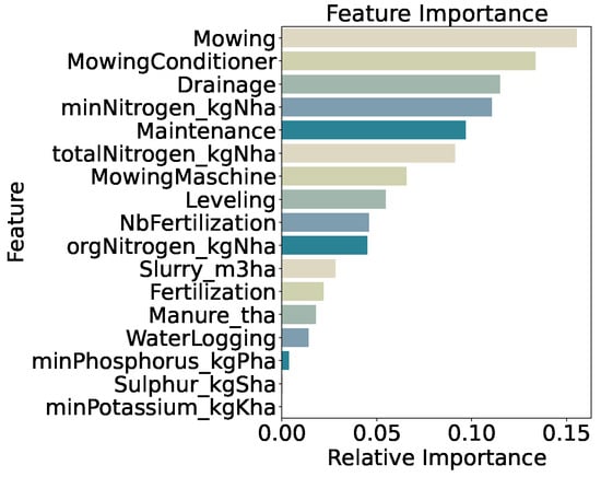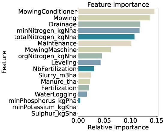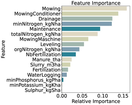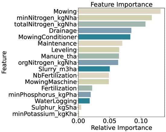 Despite declining accuracy and generalizability, feature importance patterns remained stable across the three- to five-class schemes (Figure 10, Figure 11, Figure 12, Figure 13, Figure 14, Figure 15 and Figure 16). Mowing frequency and conditioner use consistently ranked highest, followed by drainage, mineral nitrogen input, and general maintenance. This suggests that, even when precise class assignments are unreliable, these core practices dominate the available information on biomass regimes. However, given the low accuracy and limited generalizability, these importance scores most likely reflect strong patterns in the training data rather than true causal effects.