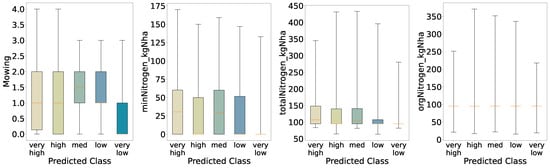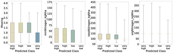 Once more, the distributions obtained from the five-class predictions (Figure 17) resemble those from the initial analysis (Figure 5) and the four-quantile scheme; nevertheless, the medium and low groups exhibit tighter interquartile ranges for annual mowing intensity and a higher median—most pronounced in the medium class—than in the initial evaluation. Another notable change is that the very high biomass class displays a low median for mineral nitrogen input. This suggests that the model inferred a link between reduced mineral nitrogen and increased biomass. Again, consistent with this, mineral nitrogen has lost feature importance relative to the binary classification, so class contrasts for this variable are less sharp. Total nitrogen follows a broadly similar pattern, as it depends on mineral nitrogen, whereas organic nitrogen remains largely unchanged. Finally, because the model does not generalize well and appears overfitted, we interpret these shifts in the non-extreme classes as signs of where the model fails to capture underlying variability.