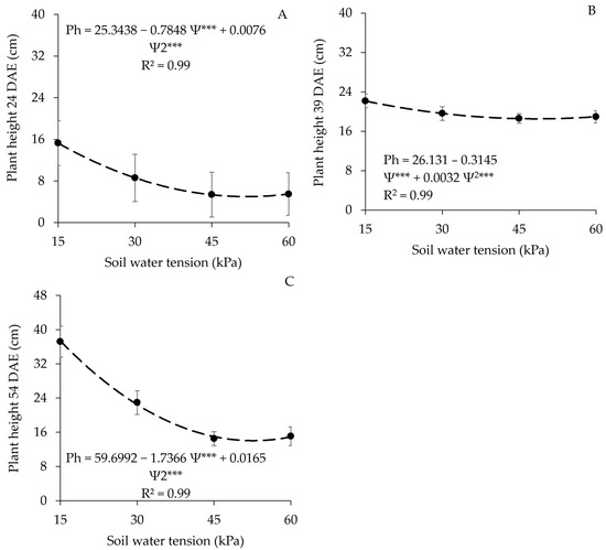 Plant height at 24 (A), 39 (B), and 54 (C) days after the emergence of cowpea plants subjected to soil water stress. Ψ = soil water tension; Ph = plant height; *** significant at a 0.1% probability.
