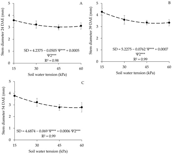 Stem diameter at 24 (A), 39 (B), and 54 (C) days after the emergence of cowpea plants subjected to soil water stress. Ψ = soil water tension; SD = stem diameter; *** significant at a 0.1% probability.