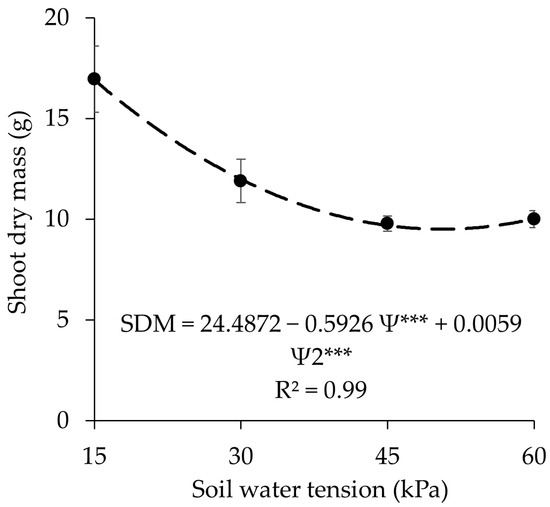 The shoot dry mass was significantly different for only the soil water stress treatments, with second-order polynomial regression, in which there was a decrease in the accumulation of mass from 15 kPa to 50.22 kPa (Figure 4). After this tension, there was an increase of 5.73% up to a voltage of 60 kPa.