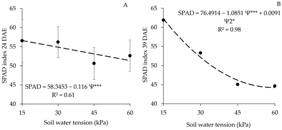 SPAD index at 24 (A) and 39 (B) days after the emergence of cowpea plants subjected to soil water stress. Ψ = soil water tension; SPAD = SPAD index; *, *** significant at 5 and 0.1% probability, respectively.