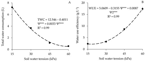 The total water consumption of cowpea changed as a function of variations in soil water tension, with a decreasing linear adjustment according to the increase in stress (Figure 6A). To estimate the effectiveness of plants in converting irrigated water into dry matter accumulation, the variable water use efficiency is used. This variable was influenced by the water tension in the soil, and at a tension of 18.13 kPa, the lowest accumulation occurred, equivalent to 2.20 g of dry matter for each liter of irrigated water (Figure 6B).