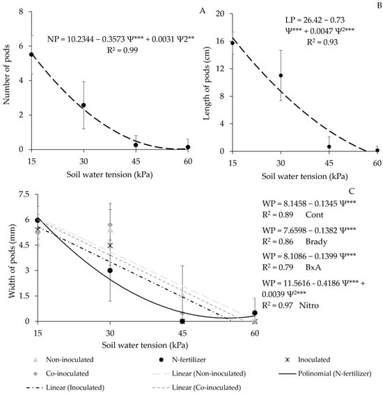 An interaction effect was observed between the inoculation factors and the water tension in the soil on the width of the pods. The use of nitrogen fertilizer showed a second-order polynomial adjustment, with a minimum point of 0.33 mm at a tension of 53.67 kPa (Figure 7C). Adjustments for the treatments not inoculated, inoculated with Bradyrhizobium, and coinoculated with Bradyrhizobium and A. brasilense decreased (Figure 7C).