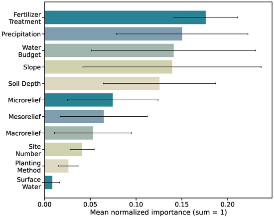 It is important to note that these aggregated results—covering the full spectrum of recorded variables and their expressions across all 1000 models—represent overall averages. This means that although some variables (e.g., Mesorelief) are strongly associated with increased mortality, the trend that Fertilizer Treatment and its different expressions provide roughly a 50/50 chance of increasing or decreasing survival appears contrary to it being ranked among the most influential features in our feature-importance analysis. However, we also observe substantial variability in feature importance across runs. Thus, while Fertilizer Treatment consistently ranks among the most influential predictors, this variability indicates that small differences in training data or overall data composition can shift its relative importance. In other words, under certain data subsets or site-specific contexts, Fertilizer Treatment may lose its role as a dominant driver of survival.