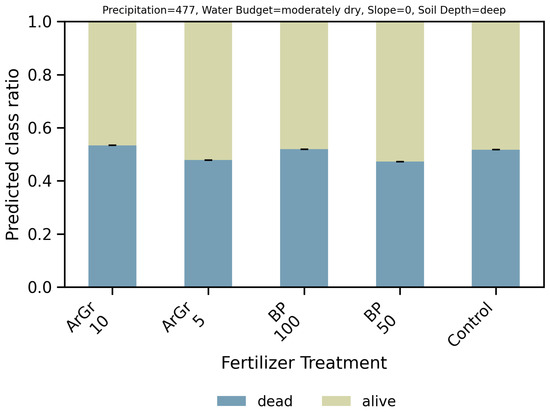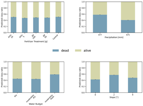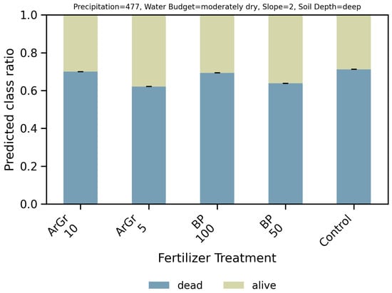 Main drivers of survival and treatment effects. Feature-importance analysis (normalized per run) ranked Fertilizer Treatment, Precipitation, Water Budget, Slope, and Soil Depth as the most influential predictors (Figure 1; Table 4). We further performed a combinatorial analysis of all features (Figure 2, Figure 3 and Figure 4), where, for each feature level, predictions were averaged over all observed combinations of the remaining features. This estimates how often a given condition is associated with dead vs. alive outcomes across the recorded feature space and over the 1000 trained models, providing a robust statistic of our modeling approach. In CatBoost, feature importance is derived from the average change in model predictions when a feature’s value is varied while keeping others fixed, aggregated across all trees and iterations. Because this process yields a distribution of importance scores across 1000 models, we report means and standard deviations to indicate variability rather than applying classical statistical significance testing, which does not directly apply to ensemble-based, nonparametric models.