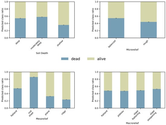 The aggregated ratios (Table 4) align with the importance ranking and show clear, interpretable trends: (i) mortality increases with slope (dead ratio: at ; Table A5); (ii) deeper soils are associated with higher mortality than shallow soils (dead ratio: shallow vs. deep ; Table A6); (iii) lower precipitation (477 mm class) shows higher mortality than the 671 mm class (dead vs. ; Table A3); (iv) sites labeled “moderately fresh” in water budget have higher mortality than dry/moderately dry categories (dead vs. /; Table A4); (v) mesorelief “mid slope” is strongly unfavorable (dead ; Table A8), while ridges and planes show lower mortality. Micro- and macrorelief show smaller but consistent contrasts (e.g., microrelief balanced vs. rough ; macrorelief slope steepening vs. plateau ; Table A7 and Table A9).