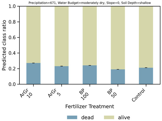 Site-conditional treatment responses. To explore how treatment effects vary under different site conditions, we generated conditional predictions based on four influential non-treatment variables: Precipitation, Slope, Soil Depth, and Water Budget. Each model () produced class predictions (dead or alive) for combinations of these features and fertilizer treatments. The predicted probability of outcome y for scenario x is shown in Equation (1), where is the number of models predicting outcome y for scenario x. Aggregated probabilities (, ) were used to visualize treatment effects across site regimes.