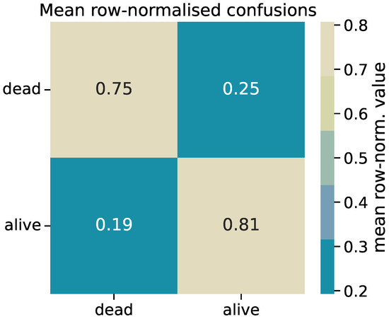 The aggregated confusion matrix shows higher correct prediciton rates for the alive class () than for dead () (Figure 8, Table 5). If management applications require a stronger focus on mortality rates, threshold tuning or cost-sensitive learning can be applied (not explored here).