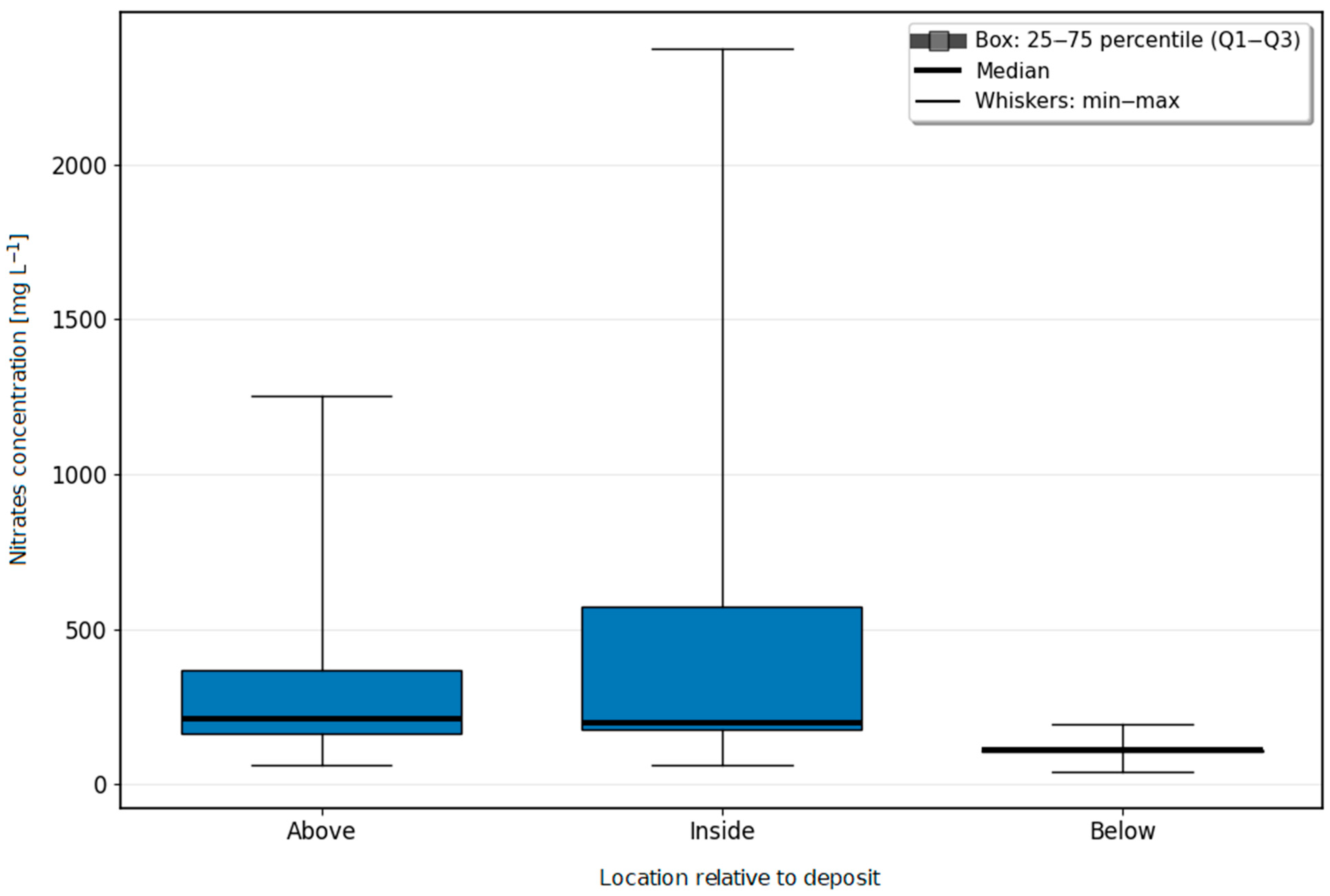 Figure 4. Mean nitrate concentrations (and +/− DS and Min/Max value) in groundwater above the vertical deposit, inside the vertical deposit and below the permeable organic barrier.