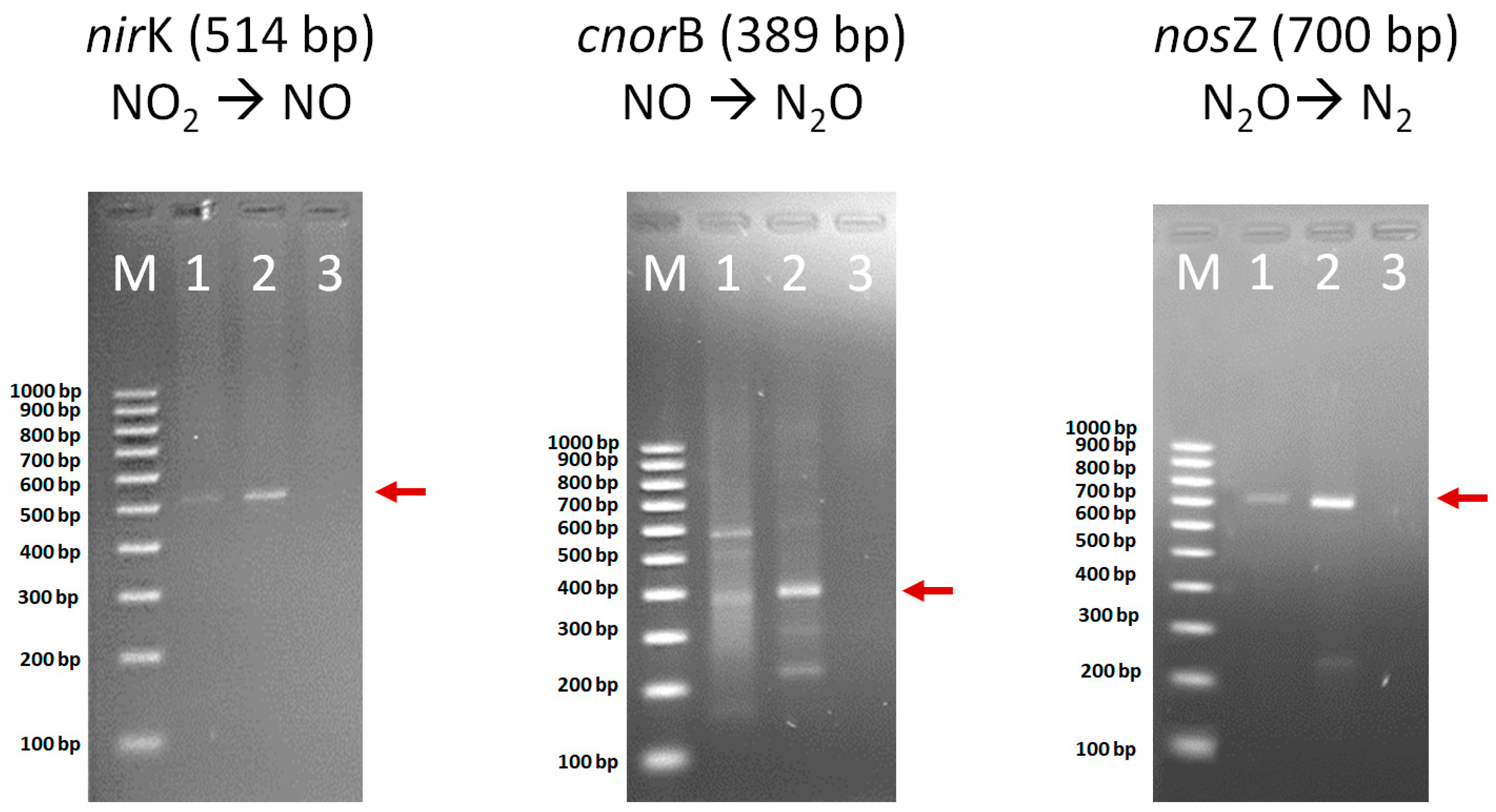Figure 6. Presence of bacterial genes (nirK, cnorB and nosZ) involved in denitrification process: 1—a sample taken above the vertical deposit of permeable organic barrier, 2—a sample taken from the vertical deposit, 3—a sample taken below the permeable organic barrier, M—marker 100–1000 bp.