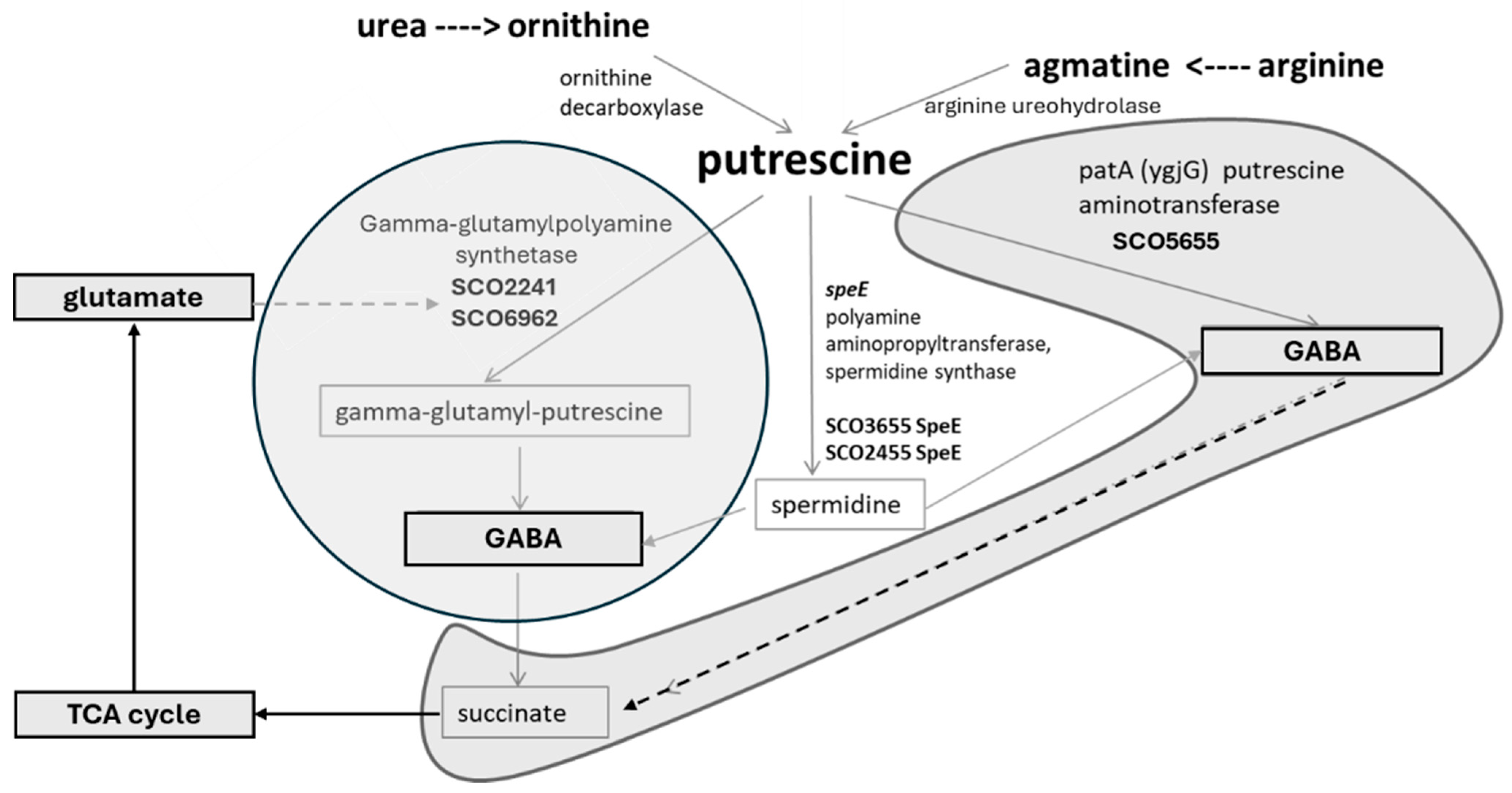 - Krysenko, S.; Okoniewski, N.; Kulik, A.; Matthews, A.; Grimpo, J.; Wohlleben, W.; Bera, A. Gamma-Glutamylpolyamine Synthetase GlnA3 is involved in the first step of polyamine degradation pathway in Streptomyces coelicolor M145. Front. Microbiol. 2017, 8, 726. [Google Scholar] [CrossRef] [PubMed]