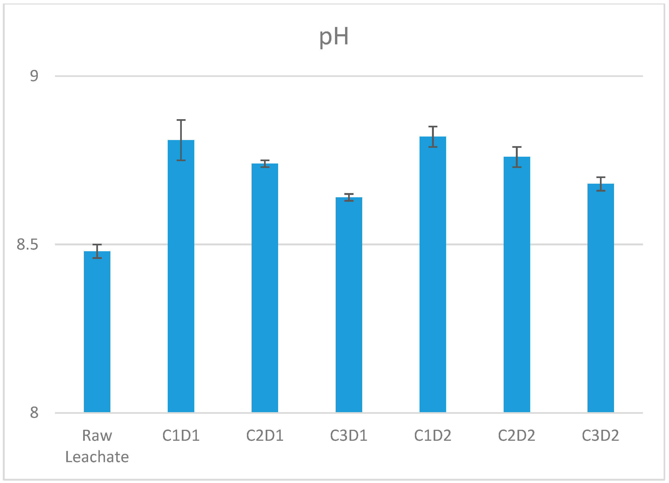 Figure 2. pH of raw leachate and supernatants after treatment with phosphate-washing sludge. C1: 25%, C2: 37%, C3: 50%, D1 = 24 h, D2 = 36 h. Values are mean ± SD (n = 3). Statistical significance assessed by one-way ANOVA (p < 0.05).