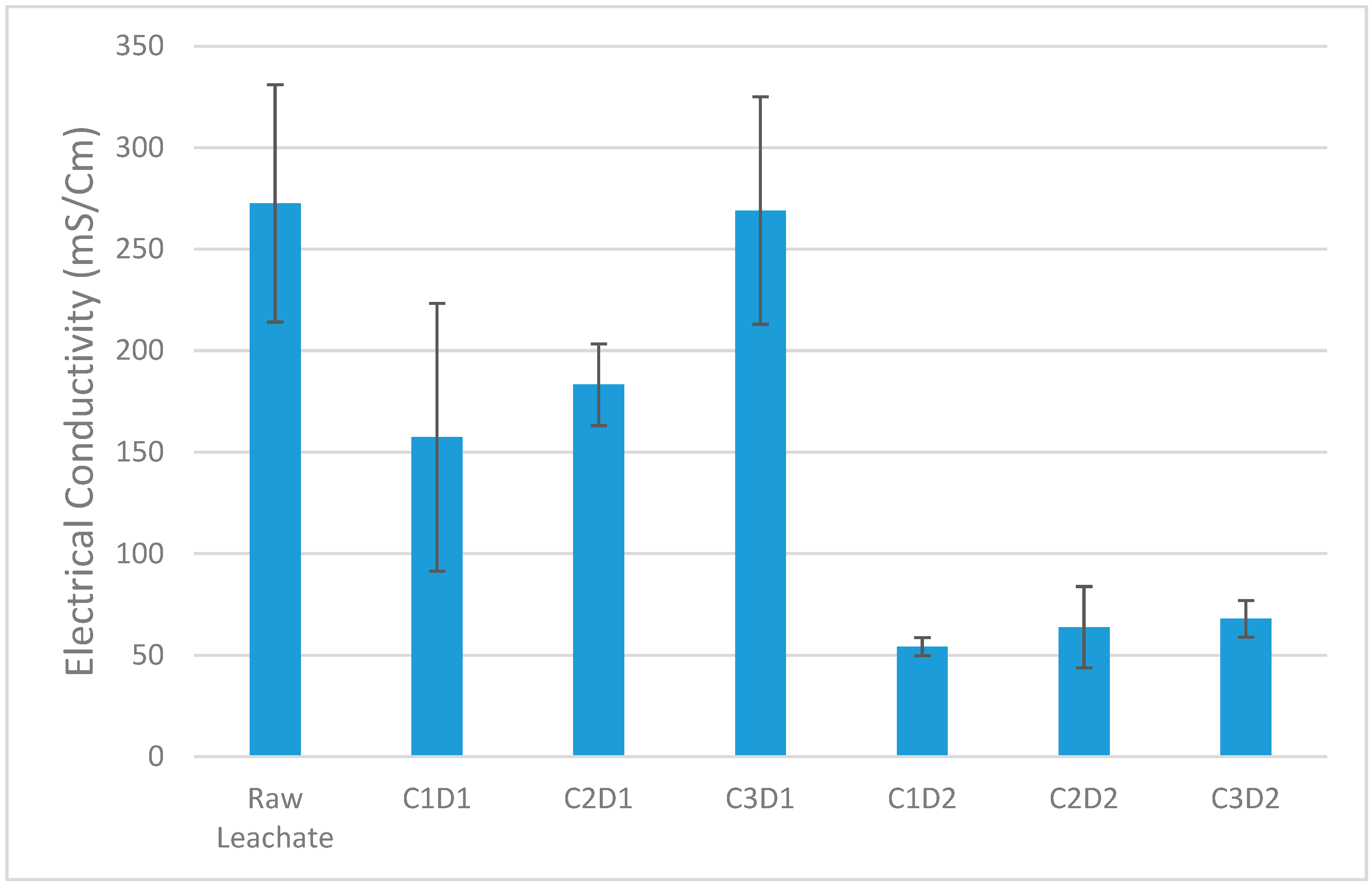 Figure 3. Electrical Conductivity of Raw Leachate and Supernatants after Treatment with Phosphate Washing Sludge. C1: 25%, C2: 37%, C3: 50%, D1 = 24 h, D2 = 36 h. Values are mean ± SD (n = 3). ANOVA test indicated highly significant differences between treatments (p < 0.001).