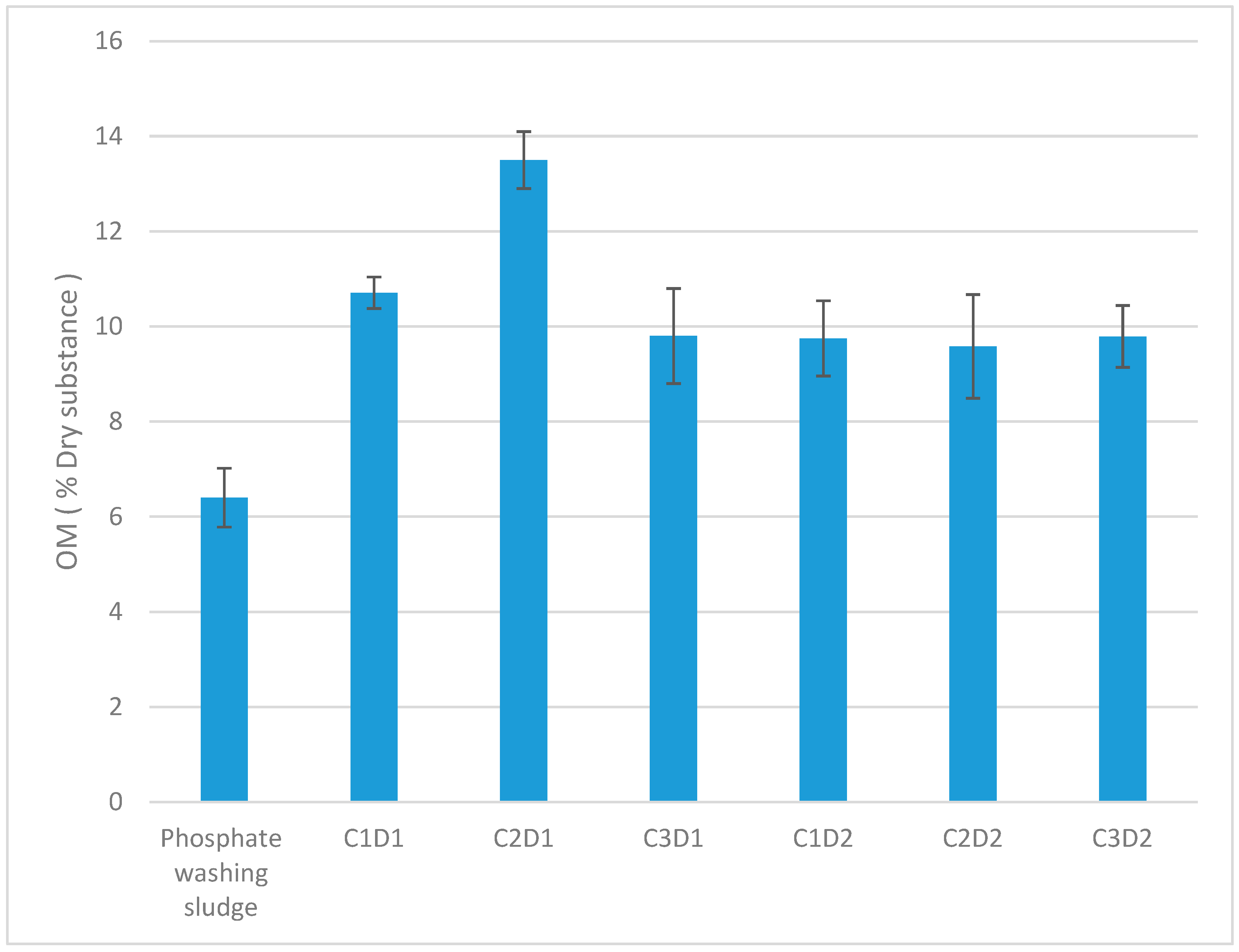 The percentage of organic matter (OM) in the sediment plays a crucial role in determining the depollution impact of phosphate sludge and also the suitability of the sediment for composting and resource recovery. As shown in Figure 3, the initial OM content of the phosphate washing sludge alone was relatively low (6.4% DS), which is expected given its mineral nature. However, once mixed with leachate, a clear improvement in OM retention was observed, especially under certain treatment conditions. The most notable increase occurred under the C2D1 condition (37% PWS, 24 h contact), where the OM content reached nearly 14%, more than doubling the initial value. This suggests that this intermediate concentration and duration favor the aggregation and sedimentation of organic particles.