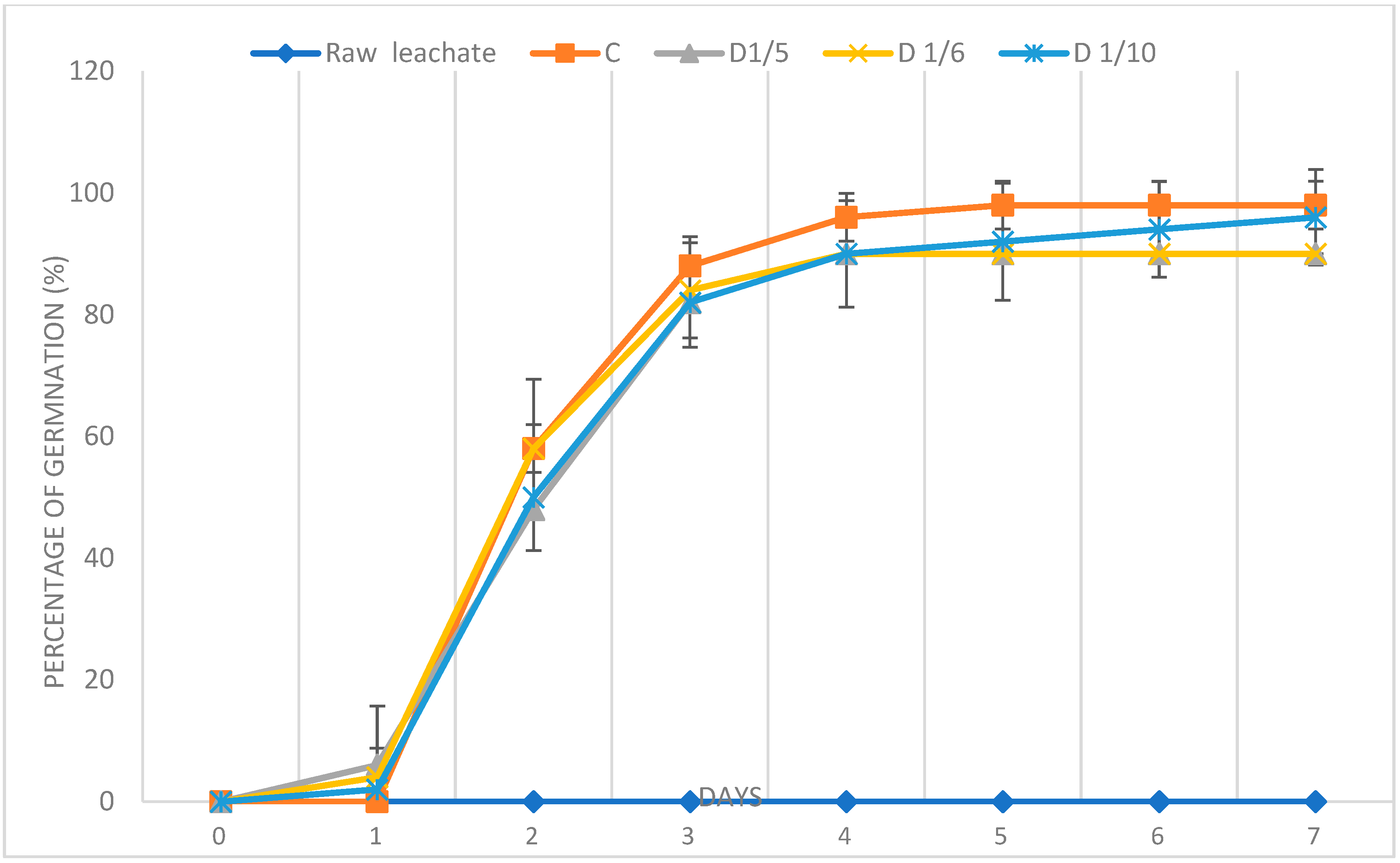 Figure 5. Seed germination percentage over time for raw leachate and diluted supernatants after treatment with phosphate washing sludge. Control C = Distilled water. Values are mean ± SD (n = 3). Statistical significance was tested using one-way ANOVA (p < 0.05).