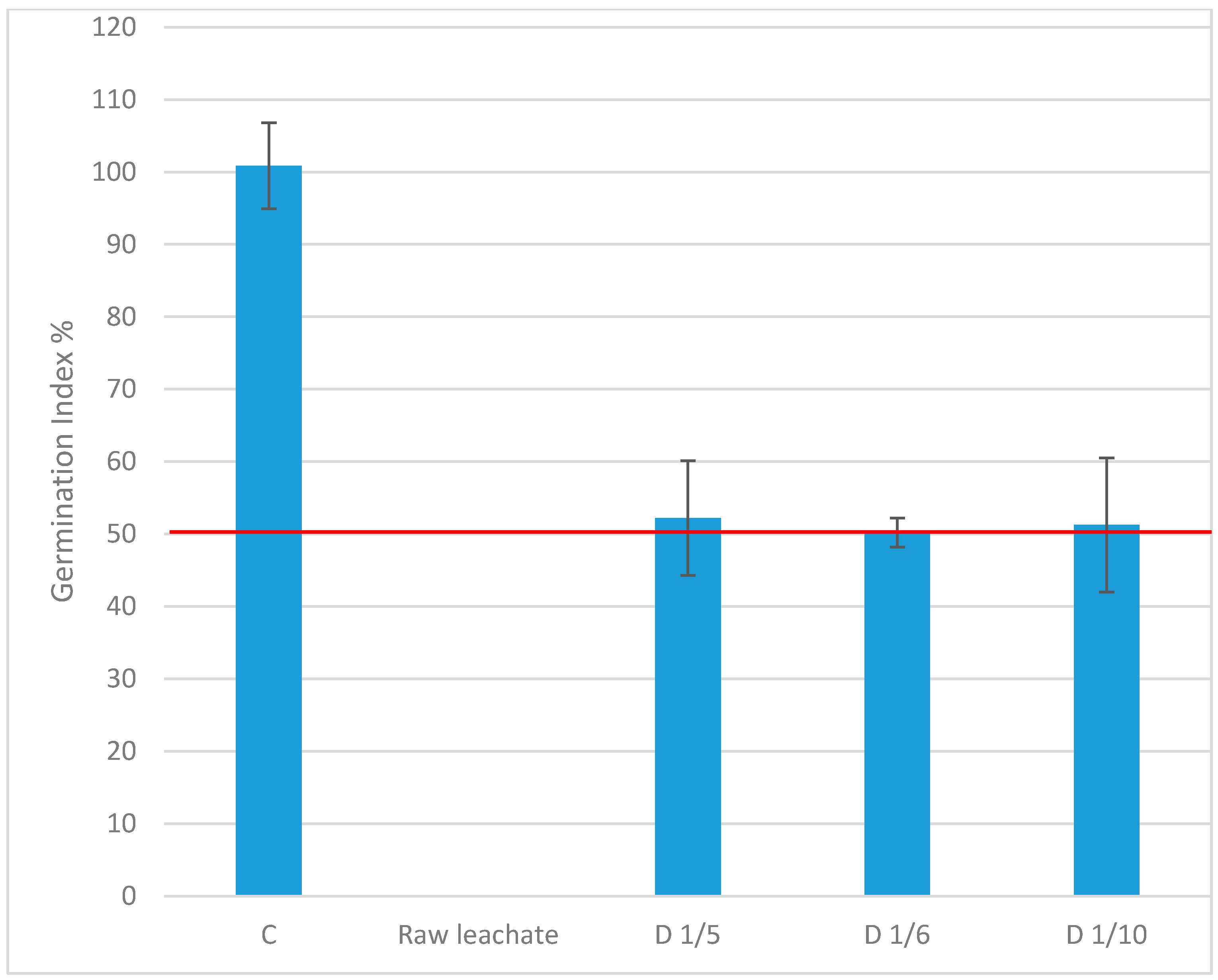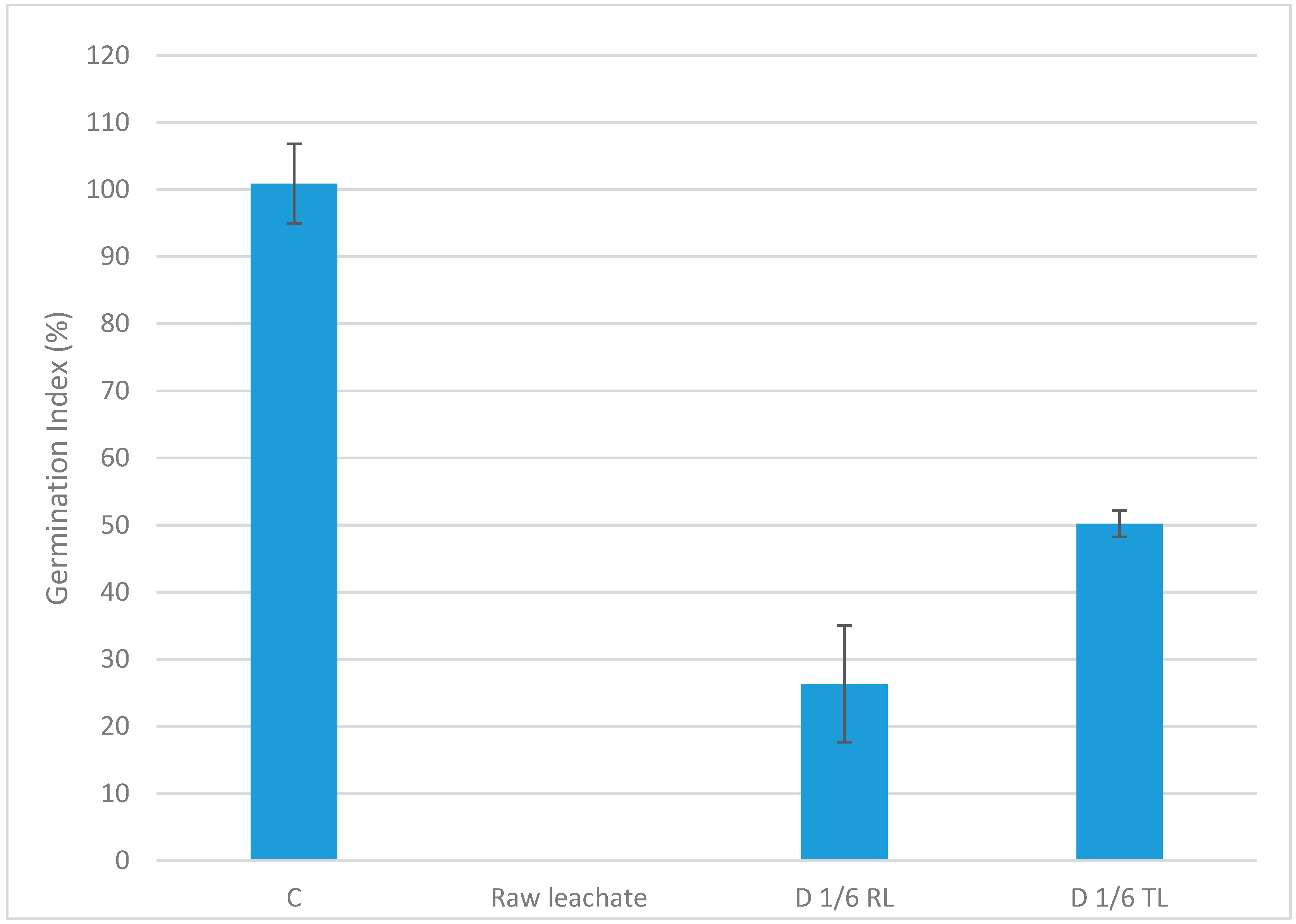 The Germination Index (GI) provides a more integrative view of phytotoxicity, as it combines both seed germination rate and root elongation. In this study, the raw landfill leachate clearly demonstrated severe phytotoxicity, with a GI close to 0%, confirming its toxic effect on plant development (Figure 5).