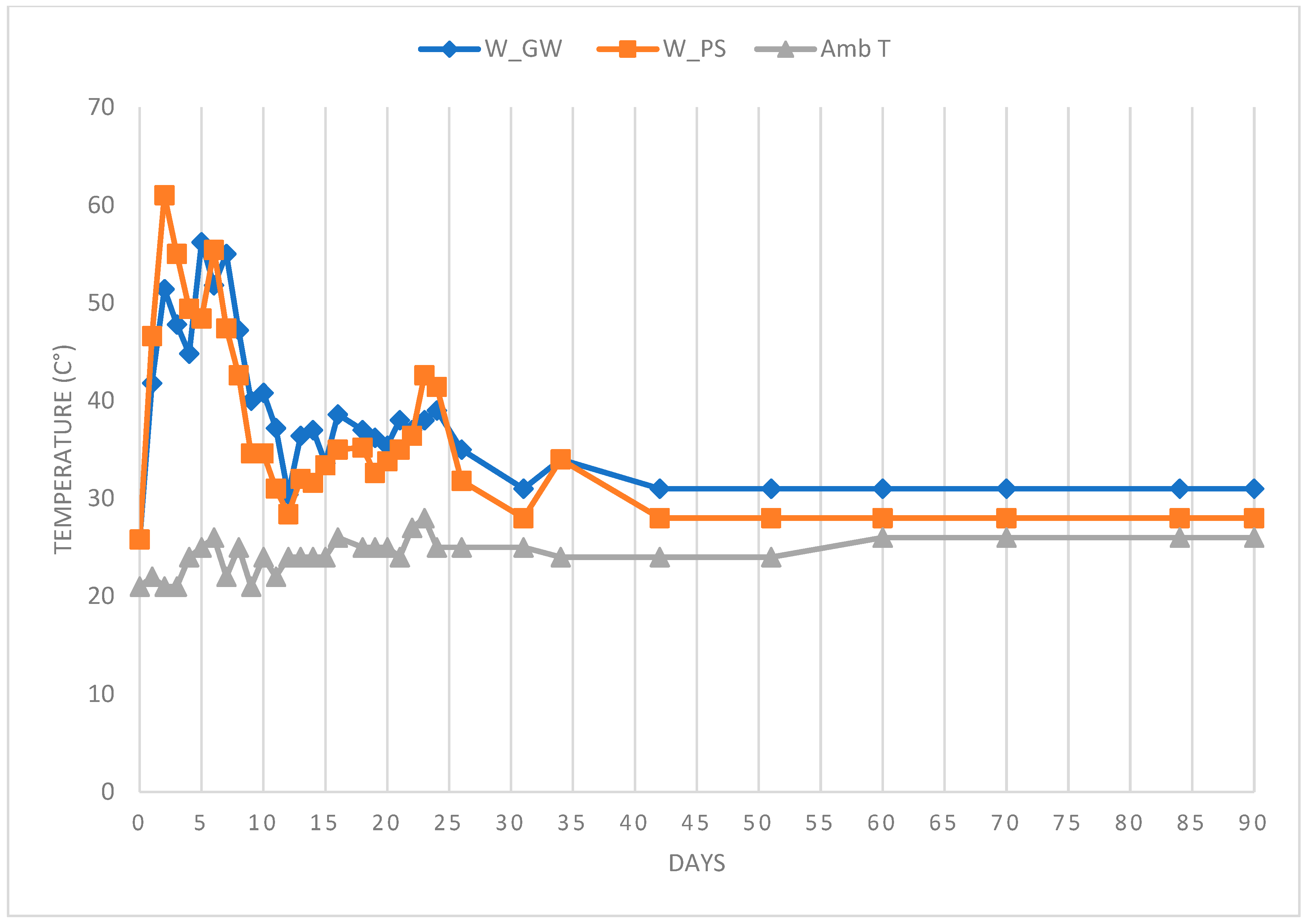 Figure 8. Temperature evolution during composting: W_GW (windrow with green waste only), W_PS (windrow with green waste with phosphate sludge), and ambient temperature (Amb_T).