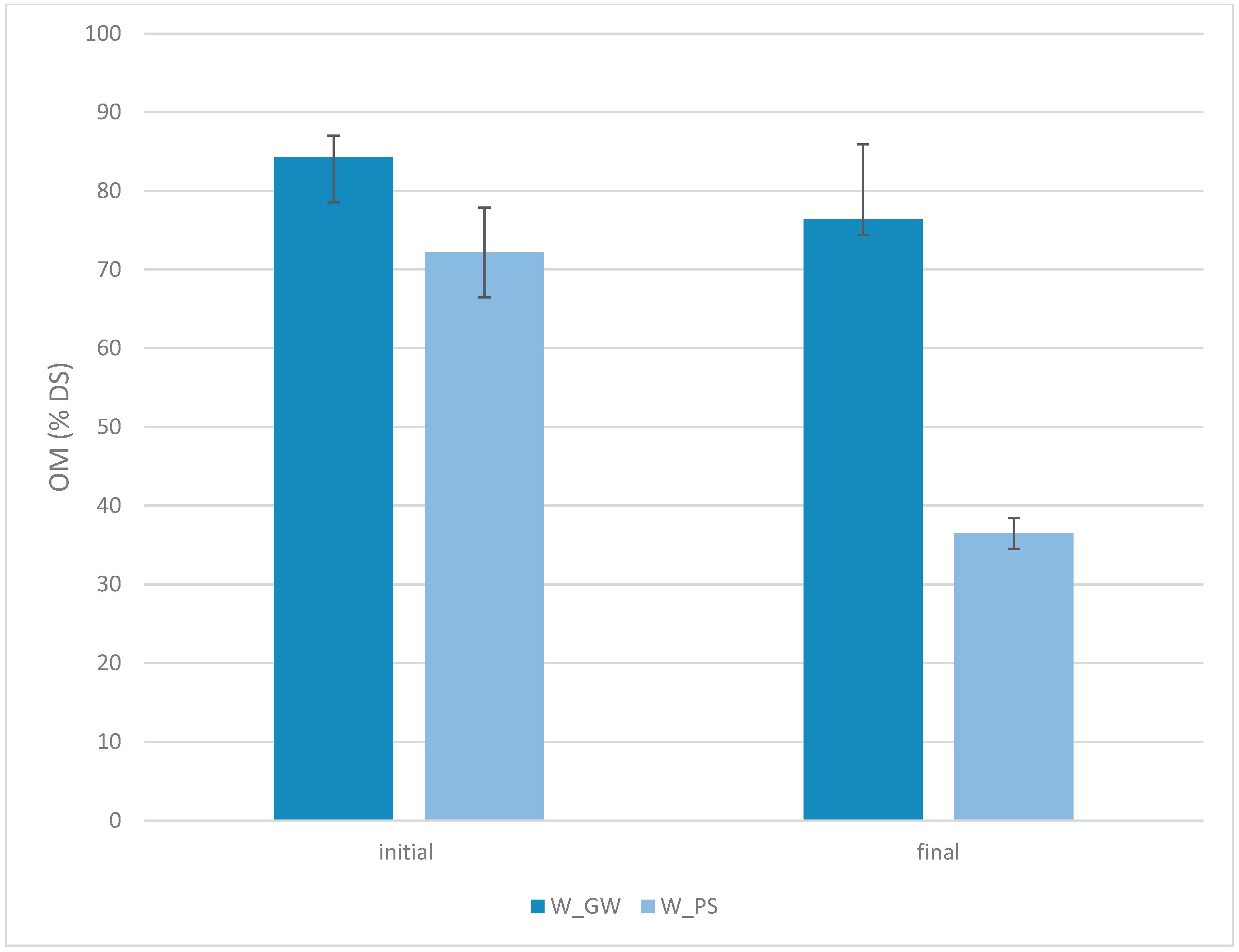 Figure 9. Reduction in organic matter content during composting: initial vs. final for W_GW (windrow with green waste only) and W_PS (windrow with green waste with phosphate sludge). Values are mean ± SD (n = 3). Statistical significance was tested using one-way ANOVA (p < 0.05).