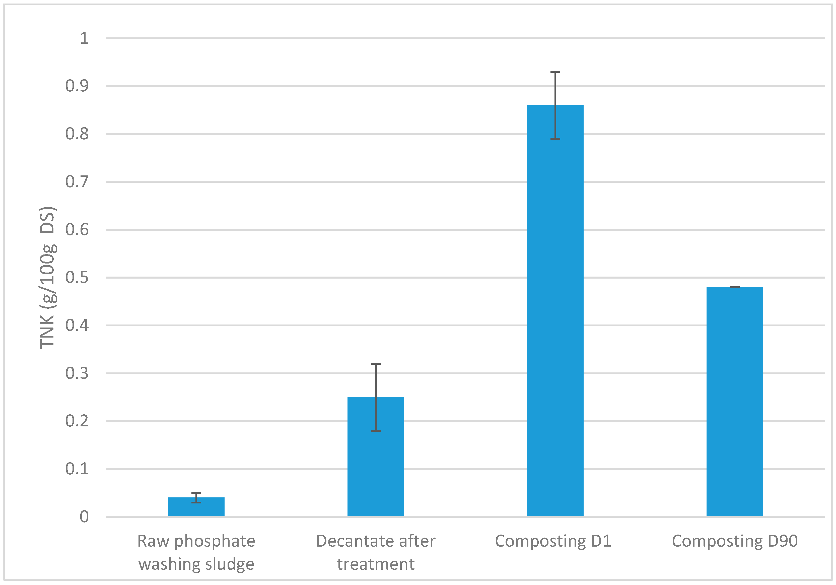 Figure 10. Evolution of total nitrogen by Kjeldahl (TNK) in the sediment after treatment with phosphate washing sludge and composting with green waste (D = day). Values are mean ± SD (n = 3). Statistical significance was tested using one-way ANOVA (p < 0.05).