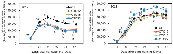 Nitrogen uptake index of rice plants during the growing season (2017, 2018). Nitrogen uptake index was calculated as plant height (cm) × number of stems (stems plant−1) × SPAD value (n = 16). CF, chemical fertilizer; CTC12, CTC applied at 12 Mg ha−1; CTC18, CTC applied at 18 Mg ha−1; CTC22, CTC applied at 22 Mg ha−1. Error bars indicate standard error, while different letters indicate significant differences (p < 0.05) according to Tukey’s test.