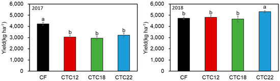Rice yield (2017, 2018) (n = 16). CF, chemical fertilizer; CTC12, CTC applied at 12 Mg ha−1; CTC18, CTC applied at 18 Mg ha−1; CTC22, CTC applied at 22 Mg ha−1. Error bars indicate standard error, while different letters indicate significant differences (p < 0.05) according to Tukey’s test.