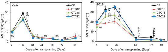 Ammonia nitrogen content in soil during the growing season (2017, 2018) (n = 4). CF, chemical fertilizer; CTC12, CTC applied at 12 Mg ha−1; CTC18, CTC applied at 18 Mg ha−1; CTC22, CTC applied at 22 Mg ha−1. Error bars indicate standard error, while different letters indicate significant differences (p < 0.05) according to Tukey’s test.