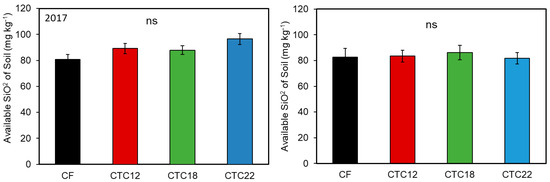 Available SiO2 in the soil after the end of rice cultivation (2017, 2018) (n = 4). CF, chemical fertilizer; CTC12, CTC applied at 12 Mg ha−1; CTC18, CTC applied at 18 Mg ha−1; CTC22, CTC applied at 22 Mg ha−1. Error bars indicate standard error, while different letters indicate significant differences (p < 0.05) according to Tukey’s test.