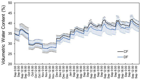 Temporal changes in soil volumetric water content measured hourly at 15 cm depth under CF and DF treatments. Values are presented as mean ± standard error (n = 3).