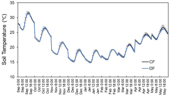 Temporal changes in soil temperature measured hourly at 15 cm depth under CF and DF treatments. Values are presented as mean ± standard error (n = 3).
