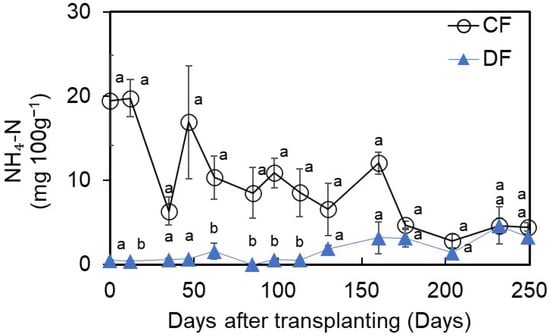 Changes in ammonium-nitrogen (NH4+-N) content in the soil during eggplant cultivation. Values are presented as mean ± standard error (n = 3). Letters indicate significant differences (p < 0.05) between different treatments at the measurement date according to Tukey’s test. Abbreviations: DF, drip fertigation; CF, conventional fertilization.