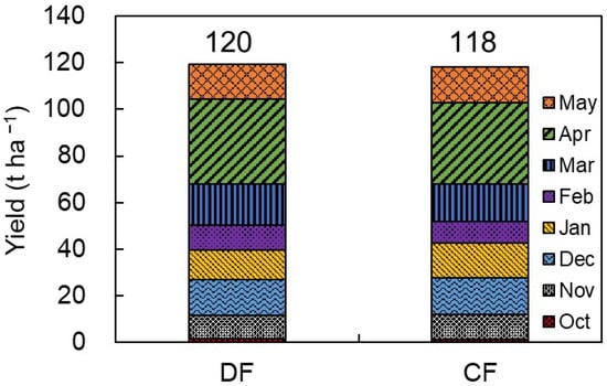 The soil NH4+-N content under the DF treatment remained low throughout the growing season (Figure 5). However, the soil NO3−-N content under the DF treatment was lower than that under the CF treatment until the middle of the growing season but attained levels comparable to those under the CF treatment in the late growing season (Figure 6). Seasonal yield distribution and total marketable yield did not differ substantially between DF and CF (Figure 7). The total yield over the entire cultivation period was 120 t ha−1 for DF and 118 t ha−1 for CF. Monthly yield patterns were also similar between treatments, although DF tended to produce slightly higher yields in several months.
