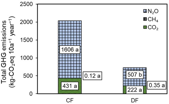 The total GHG emissions obtained by multiplying the total gas emissions, i.e., the sum of the fluxes of each gas during the growing season, and their GWP, are shown in Figure 10. N2O emissions dominated the total GHG emissions throughout the growing season of institutional eggplants in both zones, being 69.6% in DF and 78.9% in CF, followed by CO2 at 30.4% in DF and 21.1% in CF, and CH4 at less than 0.1% in both zones. The total N2O emissions were significantly lower by more than 60% under the DF treatment than under the CF treatment. There were no significant differences in the total CO2 and CH4 emissions between the treatments.