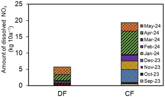 Monthly dissolved nitrate (NO3) amounts (n = 3). Abbreviations: DF, drip fertigation; CF, conventional fertilization.