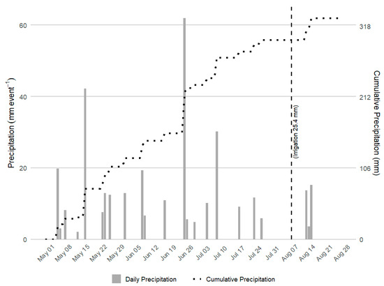 Daily precipitation (mm event−1), cumulative precipitation (mm), and irrigation event for the 120-day period of the study.
