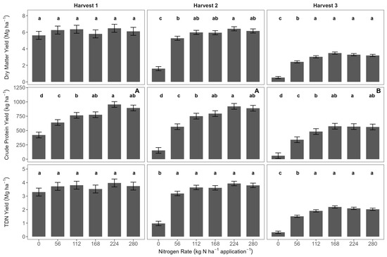 Average dry matter yield (Mg ha−1), crude protein yield (kg ha−1), and total digestible nutrient (TDN) yield (Mg ha−1) for each nitrogen (N) rate (kg N ha−1) within each harvest cycle. Lowercase letters denote significant differences for parameters within harvests; uppercase letters, when present, denote differences in parameters between harvests. Similar letters or lack of letter denote no significant differences.