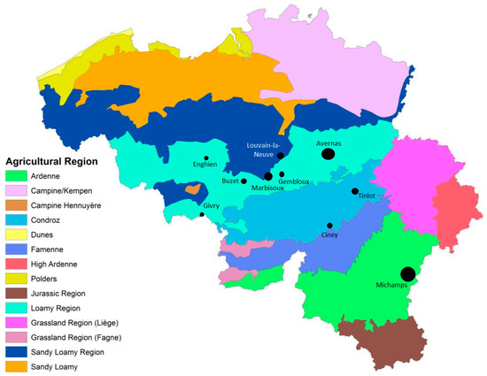Geographical location of the experimental sites in the different agricultural regions of Belgium. The size of the points is proportional to the number of experimental plots monitored on each site.