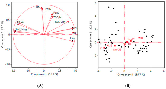 Principal component analysis (PCA) of soil and management indicators. (A) Correlation circle on PC1-PC2; (B) score plot on PC1-PC2 with centroids for management categories (GE/No-GE = grassland effect; ME/No-ME = manure; IC/No-IC = cover crop). Variables include nitrogen-mineralization indicators (ISM, PMN), soil properties (pHKCl, TOC, Nt, TOC/N, Nl, POxC, Clay), and regional averages (T°, TOC/Nreg) used in the current fertilization method. Percent variance explained is shown on axes; variables were centered and scaled to unit variance, and management categories were projected as supplementary variables.