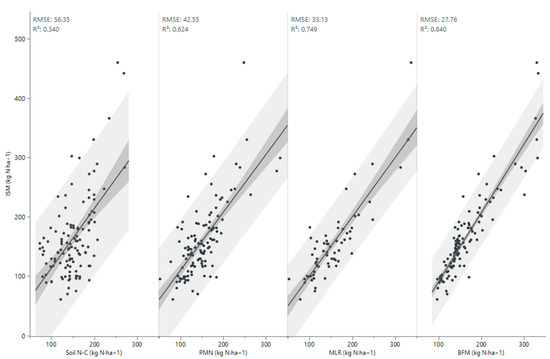The BFM achieved the highest significant correlation (r = 0.92) and the biggest reduction in dispersion compared to SOIL N-C, lowering it by 50.8% (RMSE = 27.76), i.e., about 16% lower RMSE than the MLR.