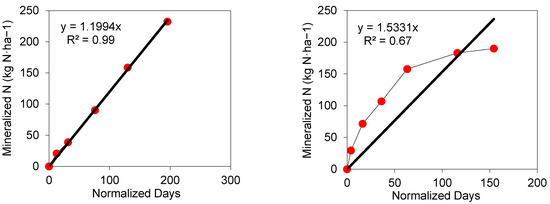 Nitrogen mineralization kinetics expressed in normalized days for two contrasting situations in 2021: a linear response in Marbisoux 4th plot (left) and a curvilinear response in Obourcy 1st plot (right) compared to the linear models (dark lines).