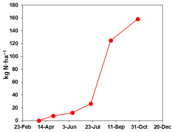Finally, weather conditions are likely to have influenced nitrogen dynamics through leaching processes. The year 2021 was exceptionally wet during our monitoring: In one experimental plot (Marbisoux 4), the LIXIM model simulated the loss of approximately 160 kg N·ha−1 via leaching between July 23 and the end of October (Figure 5). Regional rainfall records showed more than 300 mm of precipitation between June 29 and August 29 (CRA-W/Agromet.be). These heavy rainfall events inevitably disrupted the nitrogen balance and altered nitrogen availability for crops in place. Although LIXIM accounted for such exceptional conditions in its simulations, these events are difficult to anticipate at the time when fertilization decisions are made. Their increasing frequency due to climate change highlights the importance of integrating climatic risk into nitrogen management strategies. As nutrient losses through leaching become more common, the need for adaptive and resilient fertilization recommendations becomes urgent.