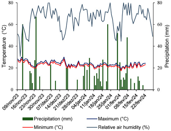 This work was carried out at the Experimental Campus of the Federal University of Mato Grosso do Sul (CPCS/UFMS) in Chapadão do Sul during the 2023/24 harvest season. The campus is located at an altitude of 790 m above sea level at the following geographical coordinates: Latitude: 18°41′33″ S″; Longitude: 52°40′45″ W″ of Greenwich. The predominant soil type is dystrophic red latosol, and the climate is humid tropical (Aw) according to the Köppen classification, with a rainy season in summer, a dry season in winter, and an average annual rainfall of 1850 mm. Figure 1 shows local rainfall and temperature data during the experimental period.