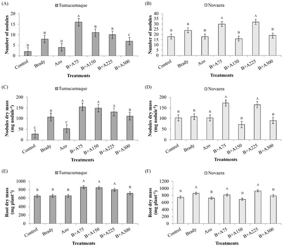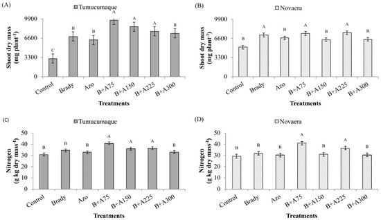 For the BRS Tumucumaque variety, the B+A75, B+A150 and B+A225 treatments produced statistically higher results for SDM. For the BRS Novaera variety, however, the Bradyrhizobium treatments B+A75 and B+A225 produced better results (Figure 3A,B). For N content (Figure 3C,D), the B+A75, B+A150 and B+A225 treatments performed best for the BRS Tumucumaque variety, while the B+A75 and B+A225 treatments showed higher N values for the BRS Novaera variety.