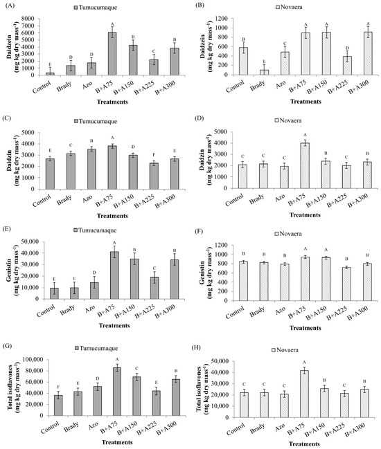In the BRS Tumucumaque variety, treatment B+A75 produced the best results for daidzein (Figure 4A), daidzin (Figure 4C), genistin (Figure 4E) and total isoflavones (Figure 4G). In the BRS Novaera variety, the best performing treatments for daidzein were B+A75, B+A225 and B+A300 (Figure 4B); for daidzin, it was B+A75 (Figure 4D); for genistin, it was B+A75 and B+A150 (Figure 4F); and for total isoflavones, it was B+A75 (Figure 4H).