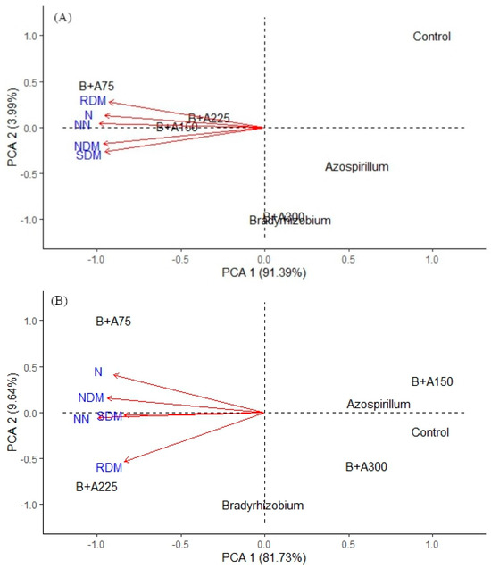 Conversely, the treatments involving B. japonicum, A. brasilense, B+A150 and B+A300, as well as the control, exhibited vectors at opposite ends, suggesting an inverse relationship within the dataset (Figure 4B). Notably, the percentage of variation explained by the first two components accounted for over 90% of the total variation in the data (Figure 4A,B).