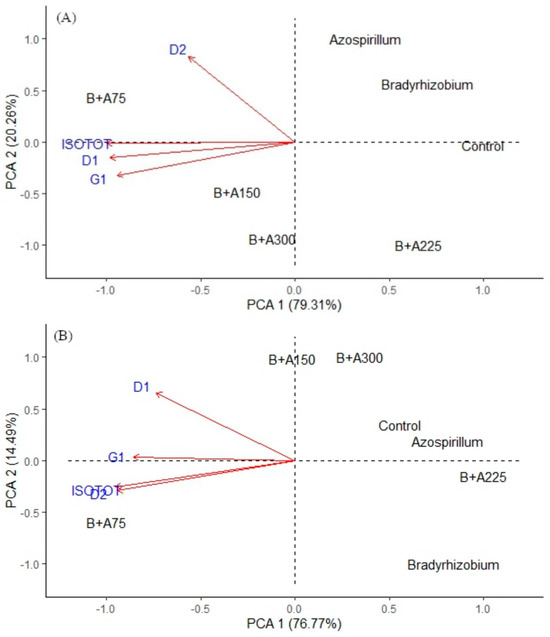 For the BRS Novaera variety, the D1 and D2 variables, as well as the Isotot, were close to the B+A75 treatment vector, while the G1 variable showed a similar distance for the B+A150 and B+A300 treatments. Finally, treatments involving isolated bacteria (B. japonicum and A. brasilense) as well as B+A225 and the control were positioned in opposite quadrants (Figure 5B), indicating a negative relationship with the presented variables. As in Figure 4A,B, the percentage of variation explained by each component is notable, with the first two components together accounting for over 90% of the total variation in the data.