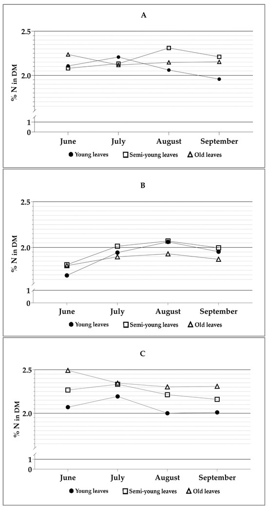 In the H1 treatment (Figure 4A), at the start of leaf sampling in June, N concentration in all leaf age categories varied in narrow range from 2.08 to 2.24%. Furthermore, a clear downward trend in N concentration was observed in the young leaves from July towards the end of the vegetation period. From June to September, the N concentration fluctuated between 1.96 and 2.31%, regardless of the age of the leaves.